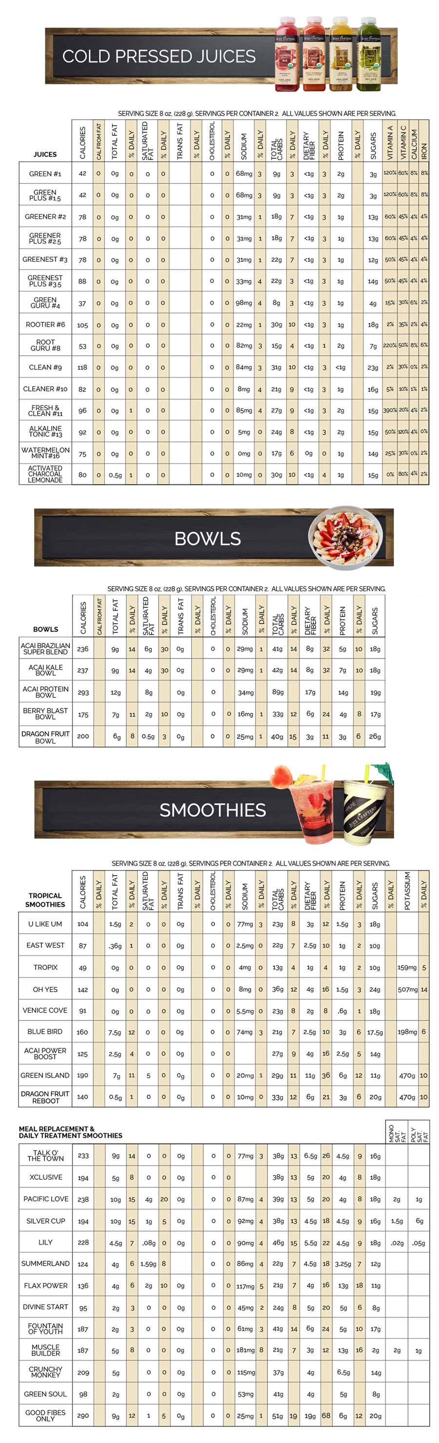| JUICES | CALORIES | CAL FROM FAT | TOTAL FAT | % DAILY | SATURATED FAT | % DAILY | TRANS FAT | % DAILY | CHOLESTEROL | % DAILY | SODIUM | % DAILY | TOTAL CARBS | % DAILY | DIETARY FIBER | % DAILY | PROTEIN | % DAILY | SUGARS | VITAMIN A | VITAMIN C | CALCIUM | IRON |